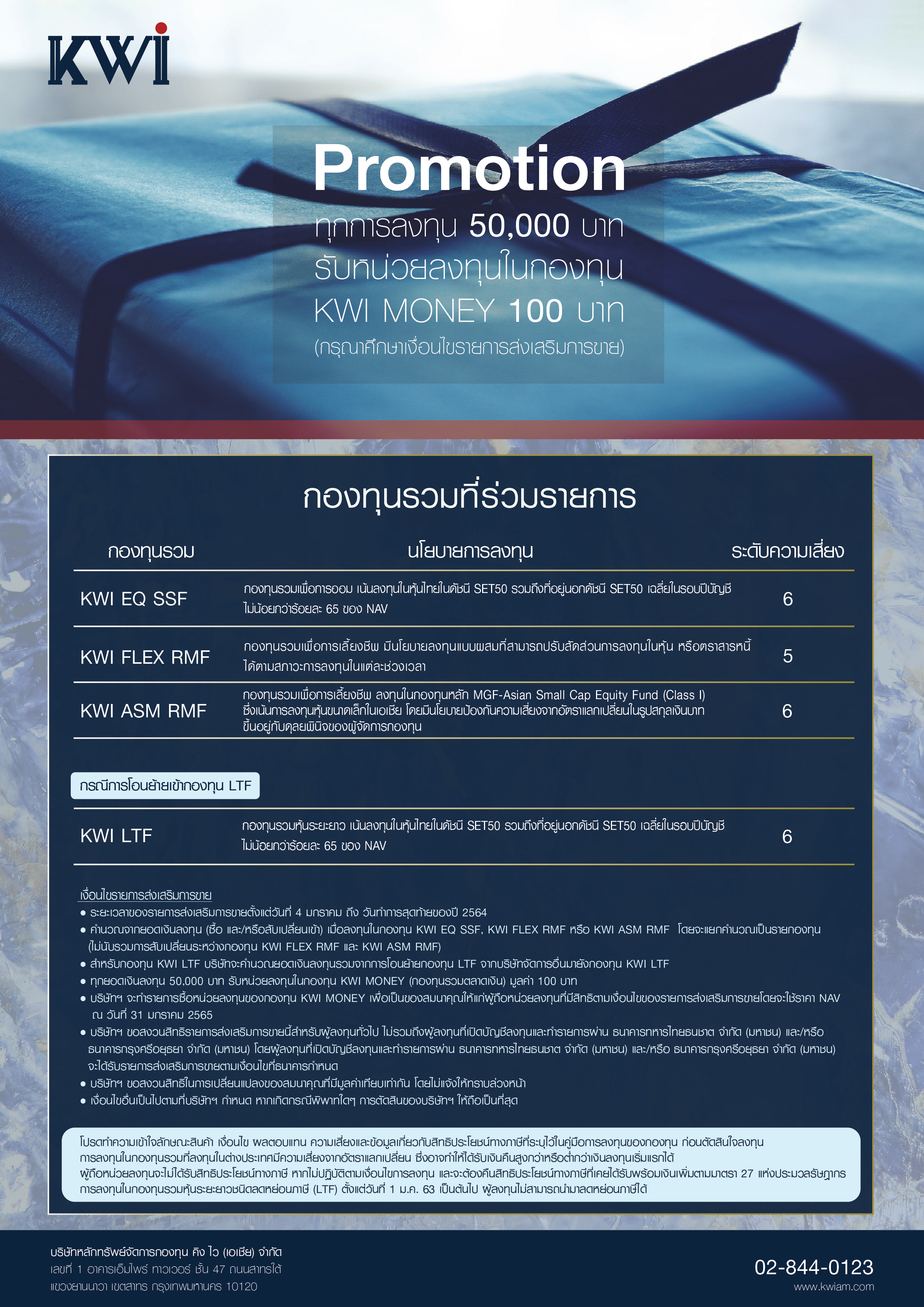 แจ้งรายละเอียดรายการส่งเสริมการขายสำหรับกองทุนเปิด KWI SSF, KWI FLEX RMF, KWI ASM RMF และ KWI LTF ประจำปี 2564